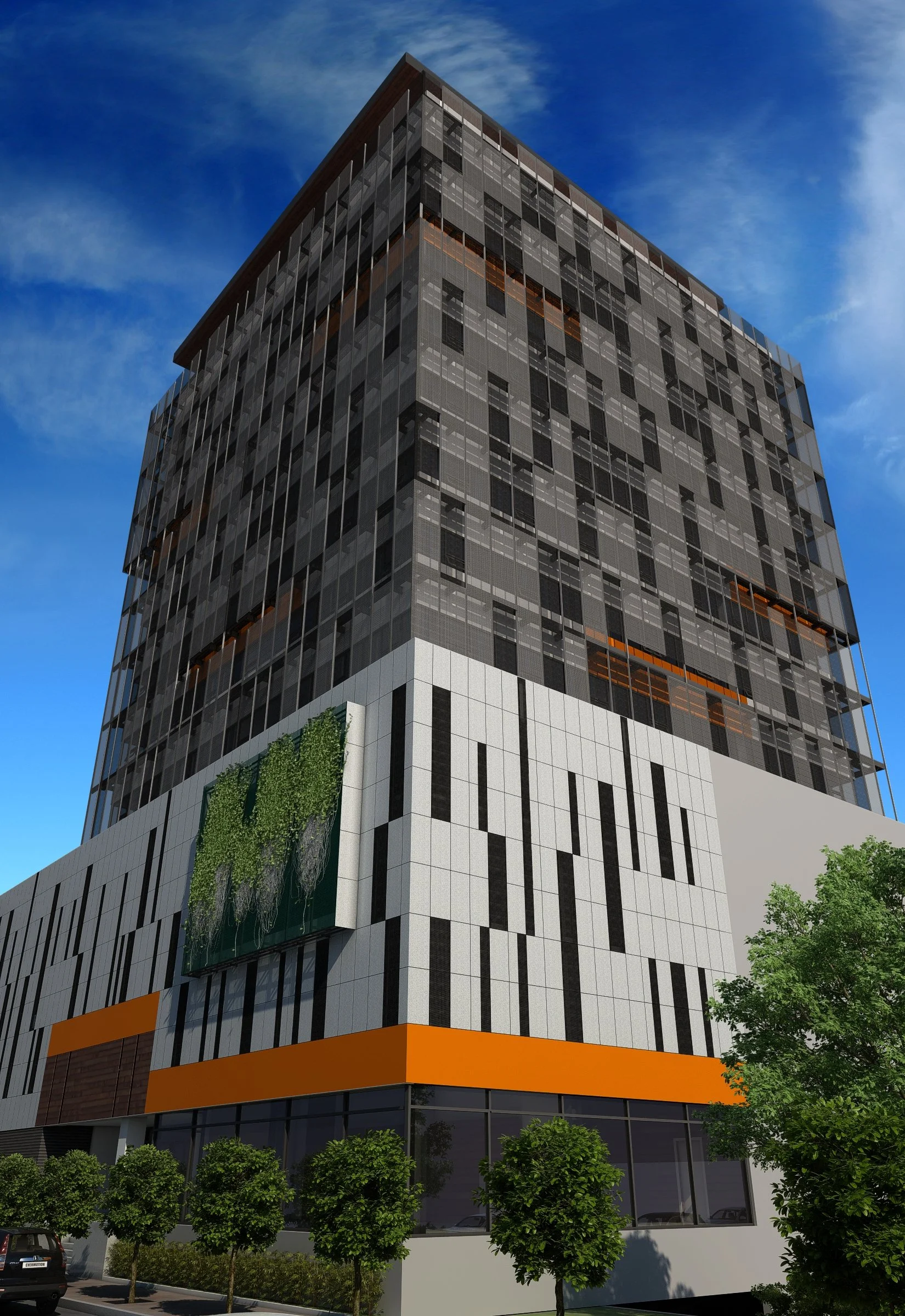 Remodelación de Fachada, incluye el acceso principal y lobby. Se implementó una estrategia de diseño sustentable para optimizar los espacios interiores, incluye un estudio de protecciones solares Península para el recubrimiento del edificio.